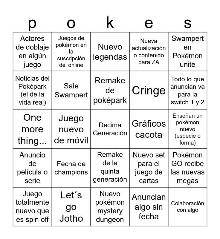 This bingo card has a free space and 24 words: Fecha de champions, Let´s go Jotho, Remake de poképark, Juego totalmente nuevo que es spin off, Swampert en Pokémon unite, Actores de doblaje en algún juego, Noticias del Poképark (el de la vida real), Juegos de pokémon en la suscripción del online, Gráficos cacota, Remake de la quinta generación, Cringe, One more thing..., Nuevo set para el juego de cartas, Pokémon GO recibe las nuevas megas, Sale Swampert, Anuncian algo sin fecha, Enseñan un pokémon nuevo (especie o forma), Nuevo legendas, Todo lo que anuncian va para la switch 1 y 2, Juego nuevo de móvil, Colaboración con algo, Anuncio de película o serie, Nueva actualización o contenido para ZA and Nuevo pokémon mystery dungeon.