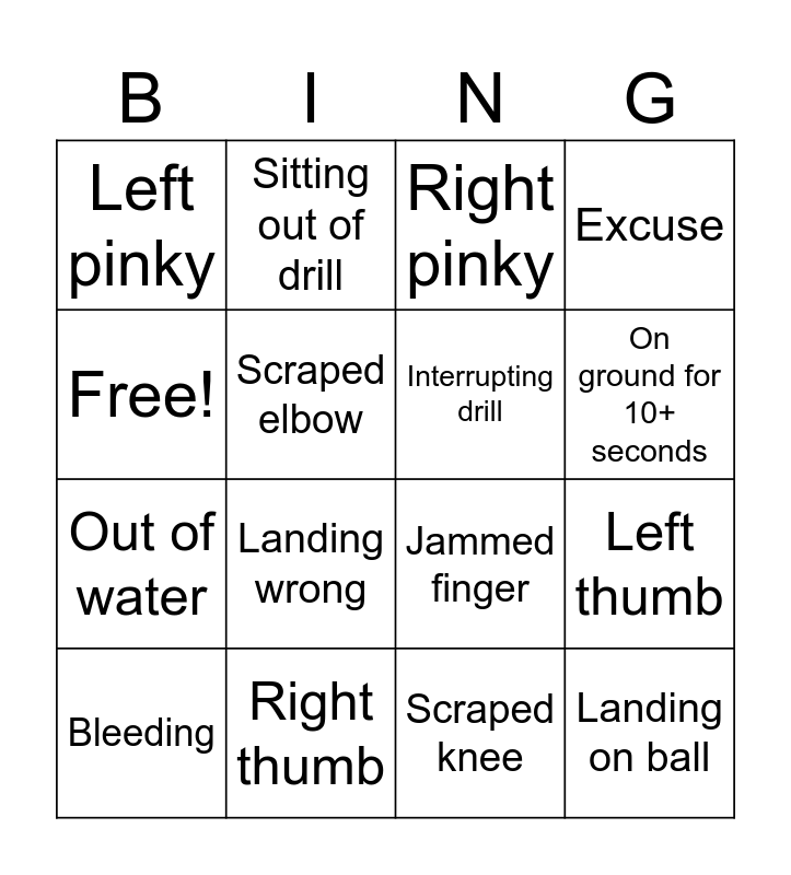 This bingo card has 16 words: Right thumb, Left thumb, Right pinky, Left pinky, Out of water, Sitting out of drill, Jammed finger, Scraped knee, Free!, Scraped elbow, Bleeding, Excuse, Landing wrong, On ground for 10+ seconds, Interrupting drill and Landing on ball.