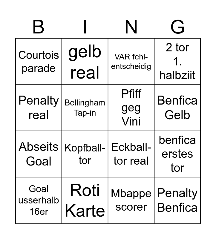 This bingo card has 16 words: Roti Karte, benfica erstes tor, VAR fehl- entscheidig, Courtois parade, Abseits Goal, gelb real, Eckball- tor real, Mbappe scorer, Penalty real, Bellingham Tap-in, Goal usserhalb 16er, 2 tor 1. halbziit, Kopfball- tor, Benfica Gelb, Pfiff geg Vini and Penalty Benfica.