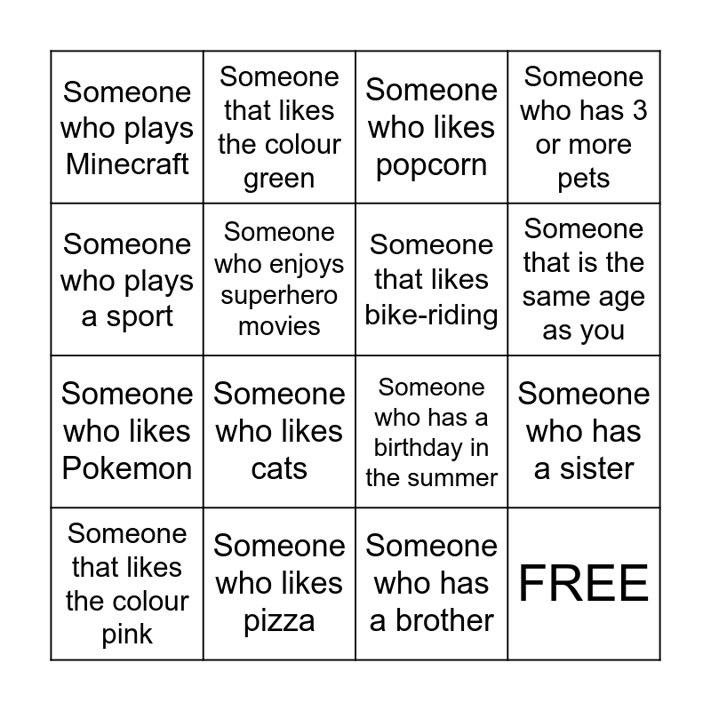 This bingo card has 16 words: Someone who likes pizza, Someone who has a sister, Someone who likes popcorn, Someone who plays Minecraft, Someone who likes Pokemon, Someone that likes the colour green, Someone who has a birthday in the summer, Someone who has a brother, Someone who plays a sport, Someone who enjoys superhero movies, Someone that likes the colour pink, Someone who has 3 or more pets, Someone who likes cats, Someone that is the same age as you, Someone that likes bike-riding and FREE.