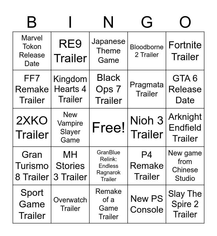 This bingo card has a free space and 24 words: MH Stories 3 Trailer, Overwatch Trailer, Black Ops 7 Trailer, Sport Game Trailer, Fortnite Trailer, Marvel Tokon Release Date, FF7 Remake Trailer, RE9 Trailer, Nioh 3 Trailer, GranBlue Relink: Endless Ragnarok Trailer, Pragmata Trailer, 2XKO Trailer, P4 Remake Trailer, New game from Chinese Studio, Kingdom Hearts 4 Trailer, New PS Console, Arknight Endfield Trailer, Japanese Theme Game, GTA 6 Release Date, New Vampire Slayer Game, Slay The Spire 2 Trailer, Gran Turismo 8 Trailer, Bloodborne 2 Trailer and Remake of a Game Trailer.