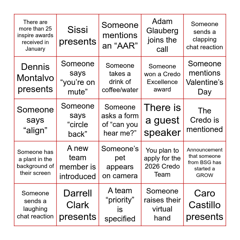 This bingo card has a free space and 40 words: Namrata speaks, Someone says “align”, Someone says “can you see my screen?”, Someone says “you’re on mute”, Darrell Clark presents, Someone’s pet appears on camera, Someone takes a drink of coffee/water, Someone mentions Q2, Someone sends a clapping chat reaction, Someone has a plant in the background of their screen, Someone says “circle back”, Adam Glauberg joins the call, Caro Castillo presents, The Credo is mentioned, There is a guest speaker, A new team member is introduced, “AI” is mentioned, There are more than 25 inspire awards received in January, Someone says “Happy New Year!”, Someone mentions an “AAR”, Announcement that someone from BSG has started a GROW, Someone raises their virtual hand, Someone won a Credo Excellence award, Dennis Montalvo presents, Music plays during the meeting, You are recognized for receiving an inspire award in January, Every attendee in the meeting has their camera on, The “Super Bowl” is mentioned, Someone on camera has a bookshelf in their background, Someone on camera is wearing a red shirt, Maria P presents, Someone sends a laughing chat reaction, Renee Hopkins presents, You plan to apply for the 2026 Credo Team, Someone mentions Valentine’s Day, A team “priority” is specified, You ask a question during Q&A, You participate in the chat, Sissi presents and A deadline is mentioned.