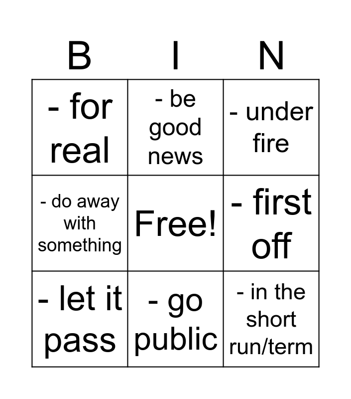 This bingo card has a free space and 9 words: - let it pass, - under fire, - be good news, - do away with something, - for real, - first off, - in the short run/term, - speak for oneself and - go public.