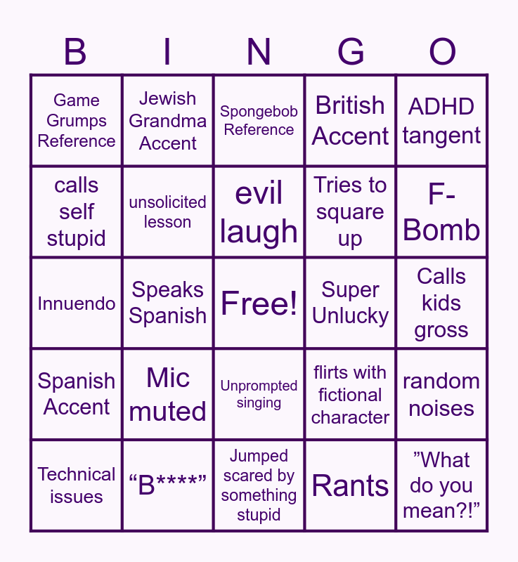 This bingo card has a free space and 29 words: Technical issues, “Heyo Heyo!”, Speaks Spanish, Falls, Game Grumps Reference, Spongebob Reference, unsolicited lesson, Mic muted, Super Unlucky, “B****”, Calls kids gross, ”What do you mean?!”, Jumped scared by something stupid, Rants, F-Bomb, Wiggles tentacles, Unprompted singing, Spanish Accent, ADHD tangent, Innuendo, flirts with fictional character, confused, Tries to square up, calls self stupid, British Accent, Jewish Grandma Accent, random noises, evil laugh and screm.