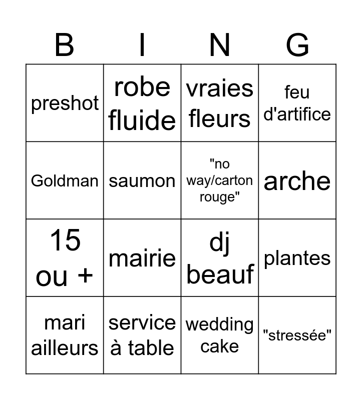 This bingo card has 16 words: service à table, plantes, vraies fleurs, preshot, 15 ou +, robe fluide, dj beauf, wedding cake, Goldman, saumon, mari ailleurs, feu d'artifice, mairie, arche, "no way/carton rouge" and "stressée".