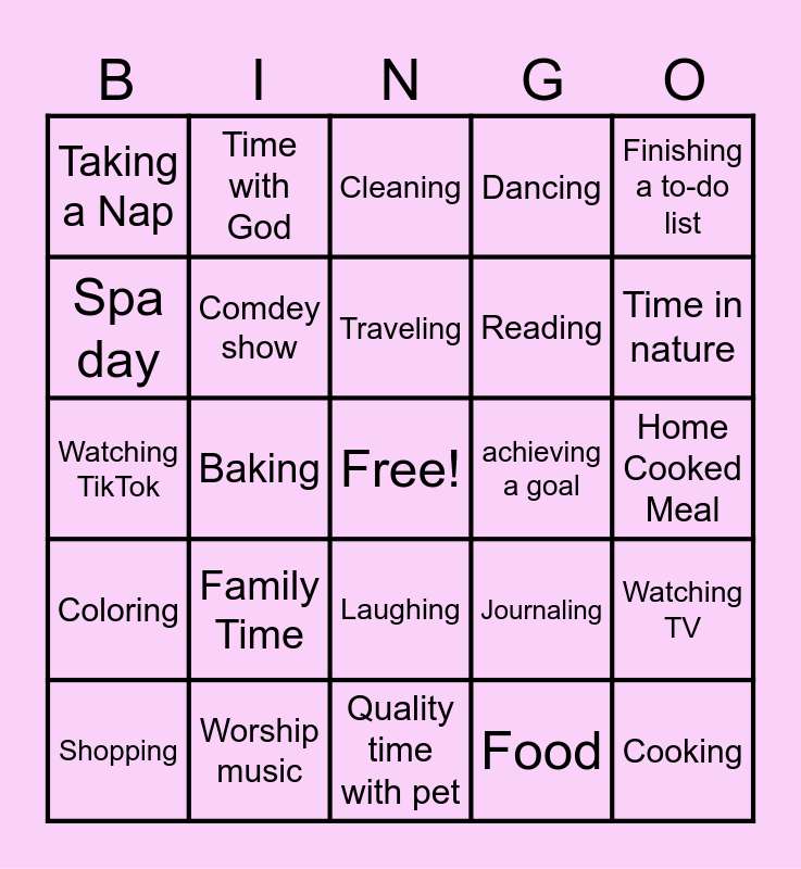 This bingo card has a free space and 25 words: Shopping, Family Time, Traveling, Food, Time in nature, Taking a Nap, Time with God, Cleaning, Reading, Watching TV, Watching TikTok, Comdey show, Journaling, Cooking, Spa day, Worship music, Quality time with pet, Dancing, Home Cooked Meal, Coloring, Baking, Laughing, achieving a goal, Finishing a to-do list and A cup of coffee.