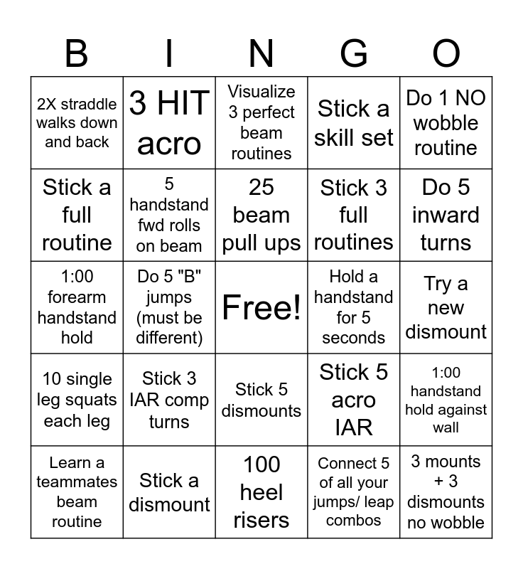 This bingo card has a free space and 24 words: Stick 3 IAR comp turns, Stick a dismount, 25 beam pull ups, Learn a teammates beam routine, Do 1 NO wobble routine, 2X straddle walks down and back, Stick a full routine, 3 HIT acro, Hold a handstand for 5 seconds, Stick 5 dismounts, Stick 3 full routines, 1:00 forearm handstand hold, Stick 5 acro IAR, 1:00 handstand hold against wall, 5 handstand fwd rolls on beam, Connect 5 of all your jumps/ leap combos, Try a new dismount, Visualize 3 perfect beam routines, Do 5 inward turns, Do 5 "B" jumps (must be different), 3 mounts + 3 dismounts no wobble, 10 single leg squats each leg, Stick a skill set and 100 heel risers.