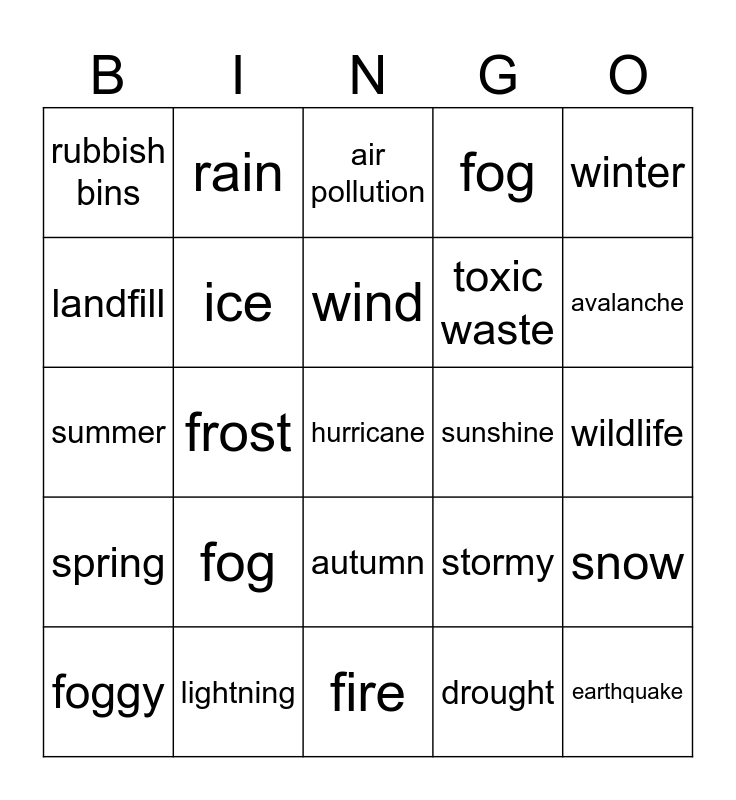 This bingo card has a free space and 29 words: foggy, rainbow, frost, windy, rubbish bins, air pollution, ice, fog, sunshine, lightning, wildlife, earthquake, fire, drought, avalanche, flood, autumn, spring, winter, summer, stormy, traffic jam, toxic waste, landfill, fog, rain, snow, wind and in summer.