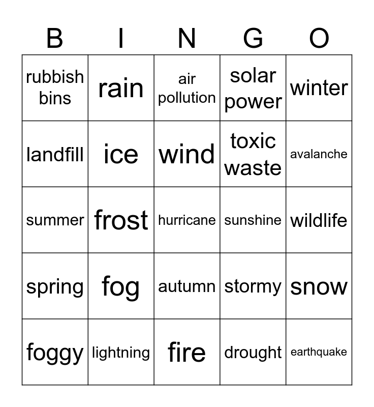 This bingo card has a free space and 29 words: foggy, rainbow, frost, windy, rubbish bins, air pollution, ice, fog, sunshine, lightning, wildlife, earthquake, fire, drought, avalanche, flood, autumn, spring, winter, summer, stormy, traffic jam, toxic waste, landfill, solar power, rain, snow, wind and in summer.