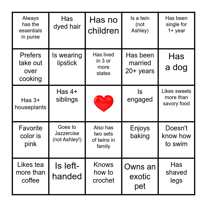 This bingo card has a free space and 24 words: Goes to Jazzercise (not Ashley!), Is left-handed, Has lived in 3 or more states, Likes tea more than coffee, Has been single for 1+ year, Always has the essentials in purse, Prefers take out over cooking, Has dyed hair, Is engaged, Also has two sets of twins in family, Has been married 20+ years, Has 3+ houseplants, Enjoys baking, Doesn't know how to swim, Is wearing lipstick, Owns an exotic pet, Likes sweets more than savory food, Has no children, Has a dog, Has 4+ siblings, Has shaved legs, Favorite color is pink, Is a twin (not Ashley) and Knows how to crochet.