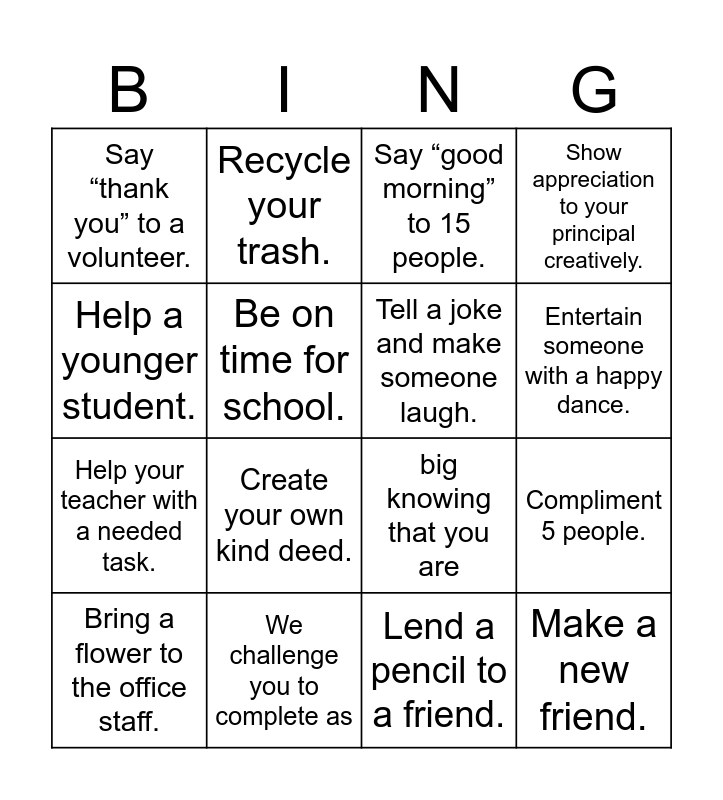 This bingo card has 32 words: Free!, Smile at 25 people., Compliment 5 people., Pick up 10 pieces of trash on campus., Make a new friend., Tell a joke and make someone laugh., Help a younger student., Give a KIND handshake to greet a classmate., Recycle your trash., Hug your friend., Entertain someone with a happy dance., Say “good morning” to 15 people., Invite a new friend to play/hang out with you., Your Kindness Matters!, We challenge you to complete as, many acts of kindness as you can, in one week. Have fun and smile, big knowing that you are, changing the world for good!, Step up for someone in need., Pat yourself on the back., Help someone up if they fall down., Lend a pencil to a friend., Learn to say “hello” in a new language., Bring a flower to the office staff., Show appreciation to your principal creatively., Help your teacher with a needed task., Be on time for school., Say “thank you” to a volunteer., Give your friend a high five., Make a friendship gift for someone new to you. and Create your own kind deed..