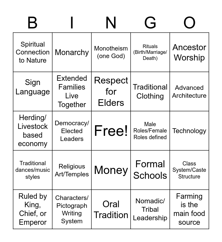 This bingo card has a free space and 29 words: Alphabet Writing System, Characters/ Pictograph Writing System, Monotheism (one God), Polytheism (multiple gods), Ancestor Worship, Spiritual Connection to Nature, Extended Families Live Together, Respect for Elders, Male Roles/Female Roles defined, Class System/Caste Structure, Ruled by King, Chief, or Emperor, Democracy/ Elected Leaders, Nomadic/ Tribal Leadership, Farming is the main food source, Herding/ Livestock based economy, Markets/ Bazaars, Oral Tradition, Formal Schools, Advanced Architecture, Traditional dances/music styles, Religious Art/Temples, Rites of Passage, Traditional Clothing, Technology, Sign Language, Monarchy, Money, Rituals (Birth/Marriage/ Death) and Folkway/ Mores/ Laws.