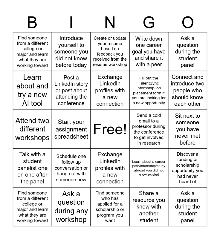 This bingo card has a free space and 30 words: Find someone from a different college or major and learn what they are working toward, Introduce yourself to someone you did not know before today, Exchange LinkedIn profiles with a new connection, Send a cold email to a professor during the conference to get involved in research, Ask a question during the student panel, Find someone from a different college or major and learn what they are working toward, Introduce yourself to someone you did not know before today, Exchange LinkedIn profiles with a new connection, Send a cold email to a professor during the conference to get involved in research, Ask a question during the student panel, Talk with a student panelist one on one after the panel, Post a LinkedIn story or post about attending the conference, Learn about one campus resource you did not know existed, Share a resource you know with another student, Discover a funding or scholarship opportunity you had never heard of, Talk to someone who is at least one year ahead of you academically, Start your assignment spreadsheet, Find someone who has applied for a scholarship or program you want, Learn about a career path/internship/study abroad you did not know existed, Connect and introduce two people who should know each other, Attend two different workshops, Ask a question during any workshop, Create or update your resume based on feedback you received from the resume workshop, Fill out the TalentSync internship/job placement form if you are looking for a new opportunity, Sit next to someone you have never met before, Learn about and try a new AI tool, Schedule one follow up conversation or hang out with someone new, Write down one opportunity you will pursue this semester, Write down one career goal you have and share it with a peer and Eat some food from the conference.