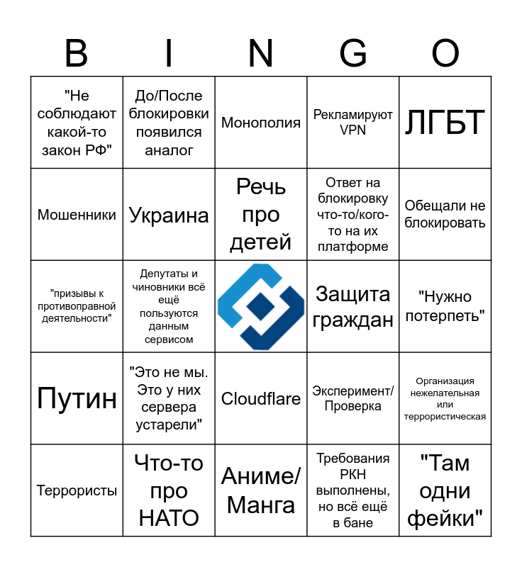 This bingo card has a free space and 24 words: "Это не мы. Это у них сервера устарели", Что-то про НАТО, Речь про детей, Террористы, ЛГБТ, "Не соблюдают какой-то закон РФ", Мошенники, До/После блокировки появился аналог, Защита граждан, Cloudflare, Ответ на блокировку что-то/кого-то на их платформе, "призывы к противоправной деятельности", Эксперимент/Проверка, Организация нежелательная или террористическая, Украина, Требования РКН выполнены, но всё ещё в бане, "Нужно потерпеть", Монополия, Обещали не блокировать, Депутаты и чиновники всё ещё пользуются данным сервисом, "Там одни фейки", Путин, Рекламируют VPN and Аниме/Манга.