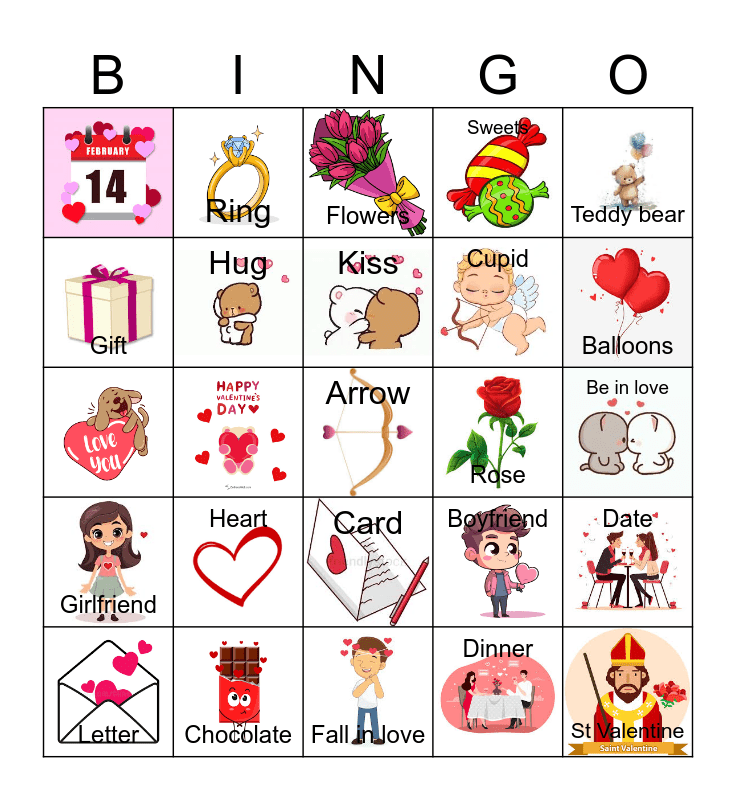 This bingo card has 24 images, a free space and 21 words: Heart, Chocolate, Kiss, Letter, Teddy bear, Gift, Ring, Rose, Card, Cupid, Boyfriend, Date, Hug, Dinner, Be in love, Flowers, Balloons, St Valentine, Girlfriend, Sweets and Fall in love.