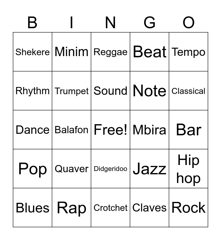 This bingo card has a free space and 35 words: Piano, Violin, Flute, Trumpet, Didgeridoo, Beat, Rhythm, Song, Sound, Music, Dance, Tempo, Drum, Djembe, Shekere, Mbira, Claves, Balafon, Pop, Rock, Jazz, Blues, Hip hop, Rap, Reggae, Classical, Folk, Pitch, Note, Bar, Line, Crotchet, Quaver, Minim and Semibreve.