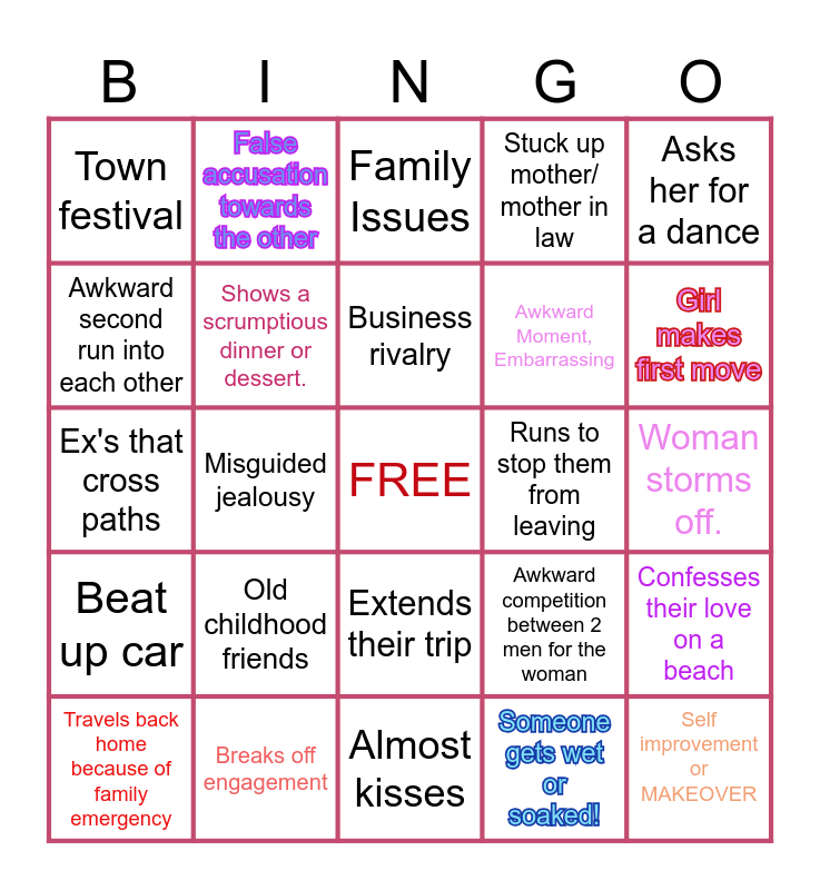 This bingo card has a free space and 24 words: Old childhood friends, Breaks off engagement, Business rivalry, Travels back home because of family emergency, Asks her for a dance, Town festival, Awkward second run into each other, False accusation towards the other, Runs to stop them from leaving, Extends their trip, Awkward Moment, Embarrassing, Ex's that cross paths, Awkward competition between 2 men for the woman, Confesses their love on a beach, Shows a scrumptious dinner or dessert., Someone gets wet or soaked!, Woman storms off., Family Issues, Girl makes first move, Misguided jealousy, Self improvement or MAKEOVER, Beat up car, Stuck up mother/ mother in law and Almost kisses.