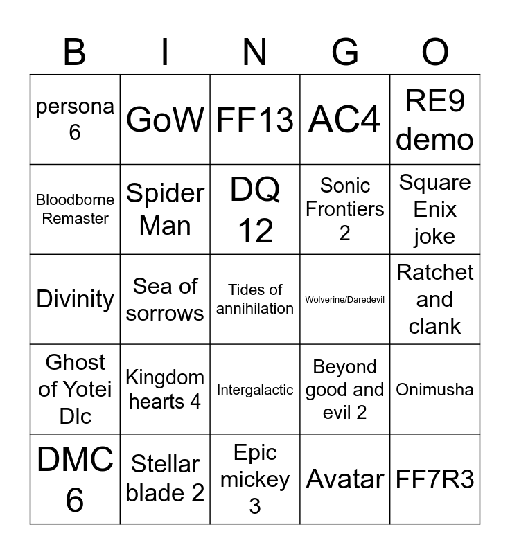 This bingo card has 25 words: Kingdom hearts 4, Epic mickey 3, DQ 12, DMC 6, RE9 demo, persona 6, Bloodborne Remaster, GoW, Wolverine/Daredevil, Intergalactic, Sonic Frontiers 2, Divinity, Beyond good and evil 2, Onimusha, Spider Man, FF7R3, Ratchet and clank, FF13, Square Enix joke, Sea of sorrows, Tides of annihilation, Stellar blade 2, Ghost of Yotei Dlc, AC4 and Avatar.