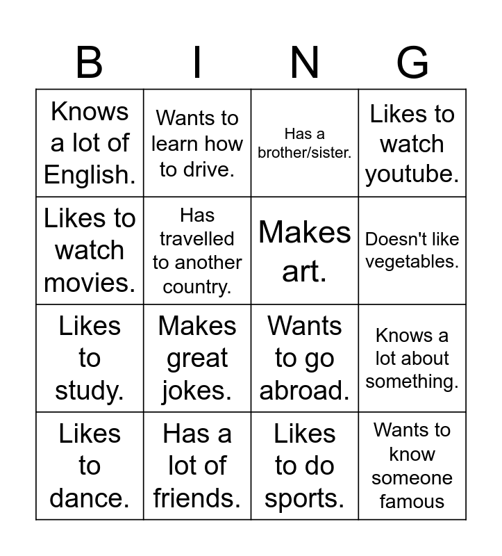 This bingo card has 24 words: Likes maths, Loves their friends, Doesn't like vegetables., Likes to read., Likes to watch movies., Knows a lot of English., Has travelled to another country., Wants to learn how to drive., Has a lot of friends., Has a favorite colour., Likes to study., Wants to go abroad., Prefers winter over summer., Enjoys cooking., Makes art., Wants to learn an instrument., Likes to do sports., Has a brother/sister., Makes great jokes., Knows a lot about something., Likes to dance., Wants to know someone famous, Likes to watch youtube. and Has a favourite subject..