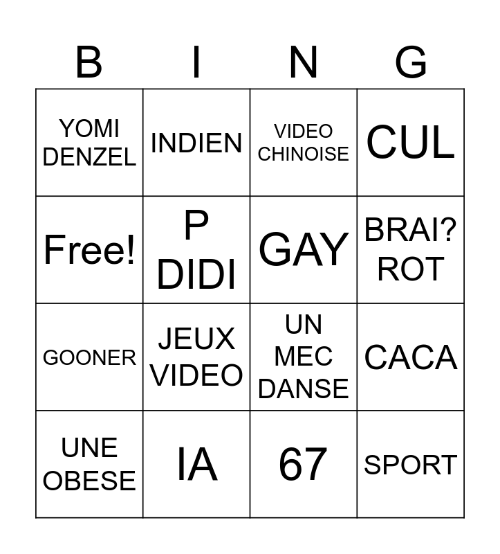 This bingo card has 16 words: IA, CACA, VIDEO CHINOISE, YOMI DENZEL, GOONER, INDIEN, UN MEC DANSE, 67, Free!, P DIDI, UNE OBESE, CUL, JEUX VIDEO, BRAI?ROT, GAY and SPORT.