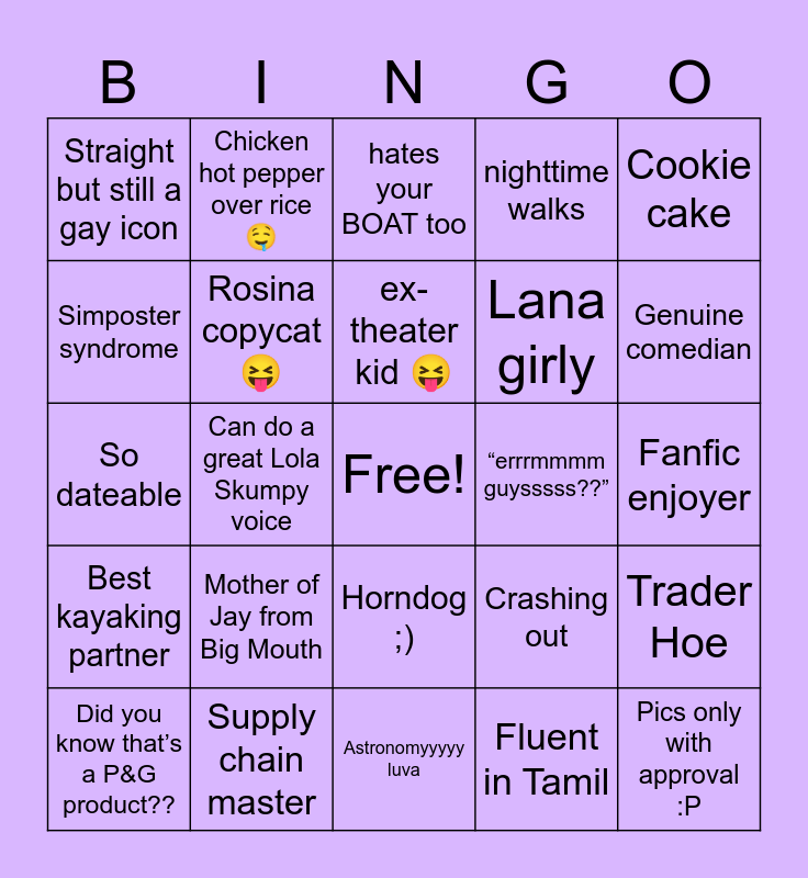 This bingo card has a free space and 24 words: Mother of Jay from Big Mouth, Supply chain master, ex-theater kid 😝, Did you know that’s a P&G product??, Cookie cake, Straight but still a gay icon, Simposter syndrome, Chicken hot pepper over rice🤤, “errrmmmm guysssss??”, Horndog ;), Lana girly, So dateable, Crashing out, Trader Hoe, Rosina copycat😝, Fluent in Tamil, Fanfic enjoyer, hates your BOAT too, Genuine comedian, Can do a great Lola Skumpy voice, Pics only with approval :P, Best kayaking partner, nighttime walks and Astronomyyyyy luva.