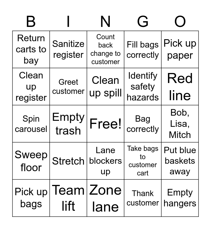 This bingo card has a free space and 24 words: Stretch, Team lift, Clean up spill, Pick up bags, Pick up paper, Return carts to bay, Clean up register, Sanitize register, Bag correctly, Lane blockers up, Identify safety hazards, Spin carousel, Take bags to customer cart, Put blue baskets away, Greet customer, Thank customer, Bob, Lisa, Mitch, Count back change to customer, Red line, Empty trash, Empty hangers, Sweep floor, Fill bags correctly and Zone lane.