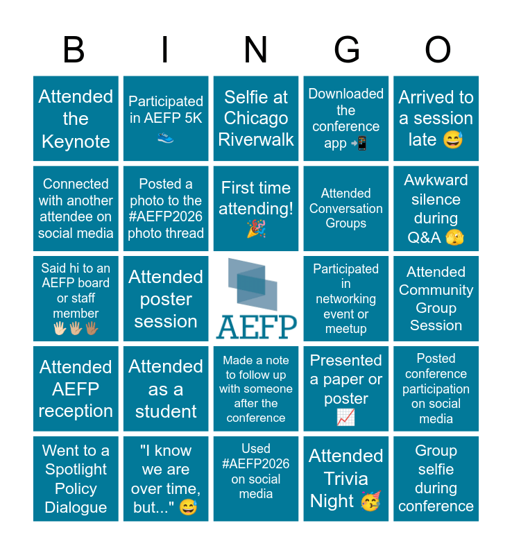 This bingo card has a free space and 24 words: Attended as a student, "I know we are over time, but..." π , First time attending!π, Went to a Spotlight Policy Dialogue, Arrived to a session late π , Attended the Keynote, Connected with another attendee on social media, Participated in AEFP 5Kπ, Participated in networking event or meetup, Made a note to follow up with someone after the conference, Attended Conversation Groups, Said hi to an AEFP board or staff member ππ»ππΌππ½, Presented a paper or poster π, Posted conference participation on social media, Posted a photo to the #AEFP2026 photo thread, Attended Trivia Night π₯³, Attended Community Group Session, Selfie at Chicago Riverwalk, Awkward silence during Q&A π«£, Attended poster session, Group selfie during conference, Attended AEFP reception, Downloaded the conference app π² and Used #AEFP2026 on social media.