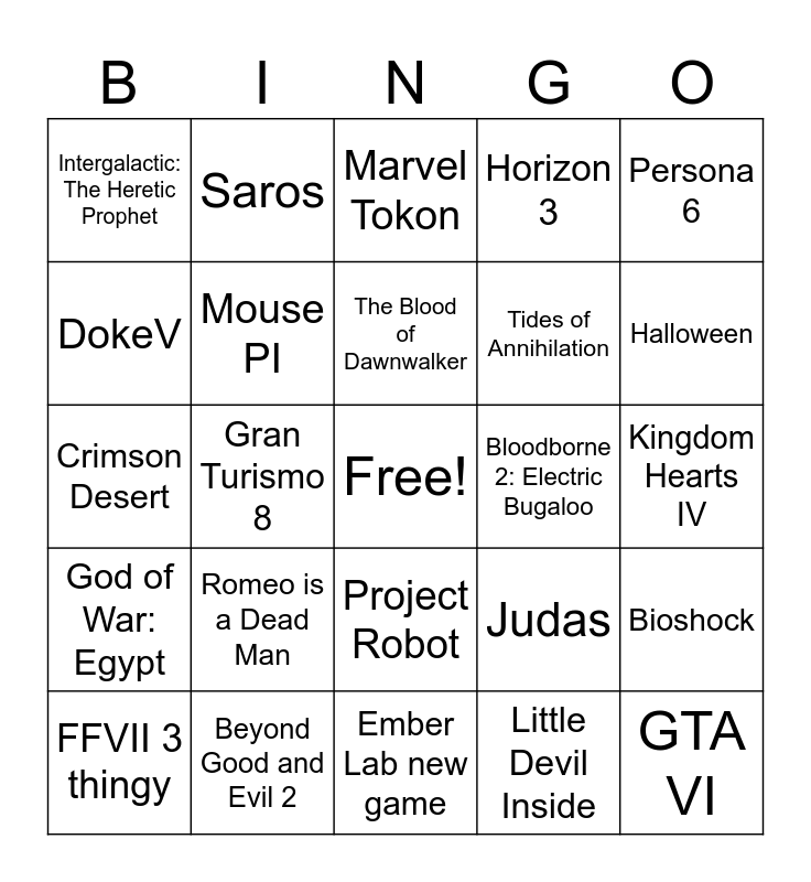 This bingo card has a free space and 24 words: Romeo is a Dead Man, Beyond Good and Evil 2, The Blood of Dawnwalker, FFVII 3 thingy, Persona 6, Intergalactic: The Heretic Prophet, DokeV, Saros, Bloodborne 2: Electric Bugaloo, Project Robot, Tides of Annihilation, Crimson Desert, Judas, Bioshock, Mouse PI, Little Devil Inside, Kingdom Hearts IV, Marvel Tokon, Halloween, Gran Turismo 8, GTA VI, God of War: Egypt, Horizon 3 and Ember Lab new game.