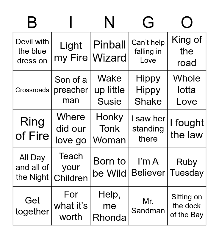 This bingo card has 54 words: A hard day’s night, All Day and all of the Night, Baby Love, Barbara Ann, Born to be Wild, Brown eyed girl, Can’t help falling in Love, Come get your Love, Crossroads, Dancing in the Moonlight, Devil with the blue dress on, Down on the corner, For what it’s worth, Get together, Happy together, Help, me Rhonda, Honky Tonk Woman, Hippy Hippy Shake, I can’t get next to you, I fought the law, I’m A Believer, I second that emotion, I saw her standing there, King of the road, Let’s twist again, Light my Fire, Looking out my Back Door, Lucy in the Sky with Diamonds, Mama told me, Mr. Sandman, My Guy, Mustang Sally, Oh, Pretty Woman, Paint it Black, Pinball Wizard, Respect, Ring of Fire, Ruby Tuesday, Sitting on the dock of the Bay, Son of a preacher man, Stand by Me, Stuck in the Middle, Sunshine of your love, Suzie Q, Teach your Children, The logical Song, These eyes, Turn, turn ,turn, Wake up little Susie, Where did our love go, Whole lotta Love, With a little help from my friends, You really got me and Your Love keeps lifting me.