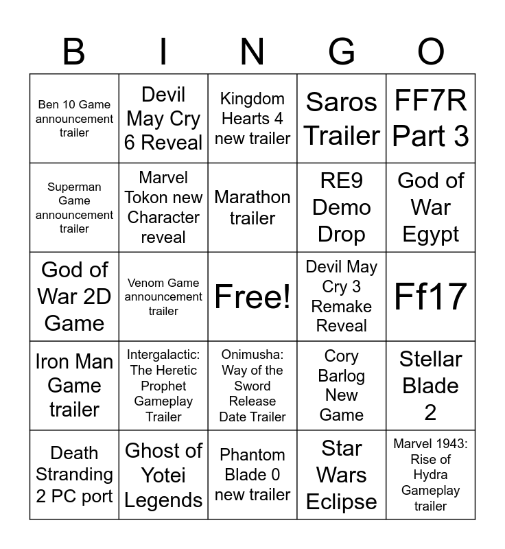 This bingo card has a free space and 24 words: Intergalactic: The Heretic Prophet Gameplay Trailer, Ghost of Yotei Legends, Marathon trailer, Death Stranding 2 PC port, FF7R Part 3, Ben 10 Game announcement trailer, Superman Game announcement trailer, Devil May Cry 6 Reveal, Devil May Cry 3 Remake Reveal, Onimusha: Way of the Sword Release Date Trailer, RE9 Demo Drop, God of War 2D Game, Cory Barlog New Game, Stellar Blade 2, Marvel Tokon new Character reveal, Star Wars Eclipse, Ff17, Kingdom Hearts 4 new trailer, God of War Egypt, Venom Game announcement trailer, Marvel 1943: Rise of Hydra Gameplay trailer, Iron Man Game trailer, Saros Trailer and Phantom Blade 0 new trailer.