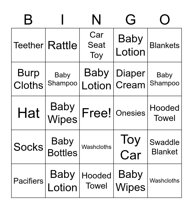 ⚠ This card has duplicate items: Stroller Accessory (3), Rattle (3), Baby Wipes (3), Onesies (3), Booties (3), Baby Monitor (3), Baby Lotion (3), Car Seat Toy (3), Diaper Cream (3), Sleep Sack (3), Pacifiers (3), Burp Cloths (3), Baby Shampoo (3), Teether (3), Diapers (3), Hat (3), Toy Car (3), Blankets (3), Socks (3), Hooded Towel (3), Baby Bottles (3), Washcloths (3), Swaddle Blanket (3), "That's so cute!" (3)