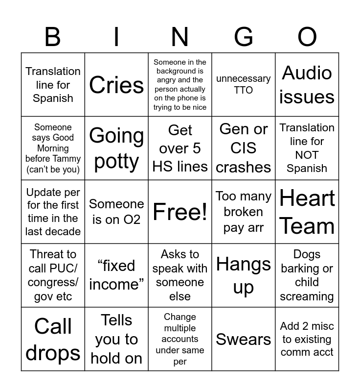 This bingo card has a free space and 34 words: Escalate, Swears, switches from phone to car, Mom calls in for son, Threat to call PUC/ congress/ gov etc, Going potty, Audio issues, Call drops, Cries, Escalate, Get over 5 HS lines, Someone in the background is angry and the person actually on the phone is trying to be nice, Name drop of techs or other employees, Threat to go all electric or propane, Too many broken pay arr, Translation line for NOT Spanish, Tells you to hold on, Update per for the first time in the last decade, “fixed income”, Hangs up, Asks to speak with someone else, Gets back on Ebill, Translation line for Spanish, Heart Team, Change multiple accounts under same per, Add 2 misc to existing comm acct, unnecessary TTO, Dispatch TTO, Gen or CIS crashes, Someone says Good Morning before Tammy (can’t be you), Feel like you should have used translation line, Someone is on O2, Dogs barking or child screaming and I have kids!.