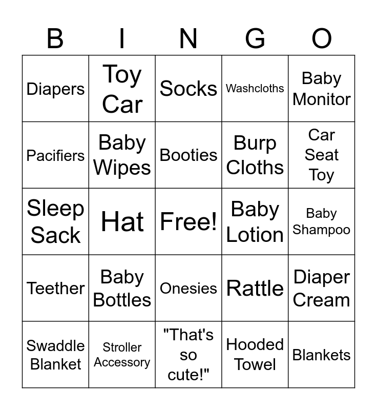 This bingo card has a free space and 24 words: Baby Bottles, Stroller Accessory, Booties, Swaddle Blanket, Baby Monitor, Diapers, Pacifiers, Toy Car, Baby Lotion, Onesies, Burp Cloths, Sleep Sack, Rattle, Diaper Cream, Baby Wipes, Hooded Towel, Baby Shampoo, Socks, Car Seat Toy, Hat, Blankets, Teether, Washcloths and "That's so cute!".