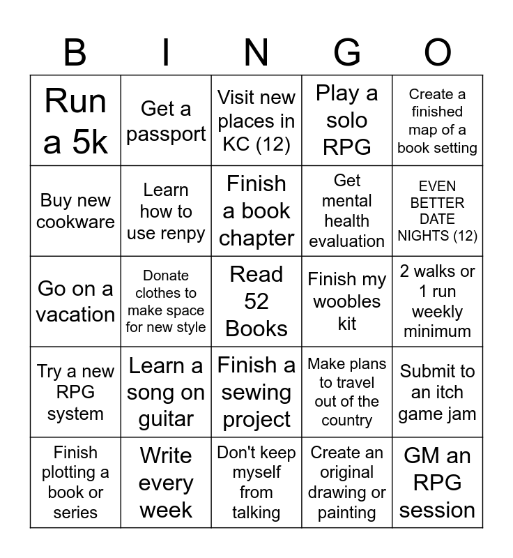 This bingo card has a free space and 24 words: Learn a song on guitar, Write every week, Finish a book chapter, Finish plotting a book or series, Create a finished map of a book setting, Run a 5k, Buy new cookware, Get a passport, Finish my woobles kit, Finish a sewing project, Get mental health evaluation, Go on a vacation, Make plans to travel out of the country, Submit to an itch game jam, Learn how to use renpy, Create an original drawing or painting, 2 walks or 1 run weekly minimum, Visit new places in KC (12), EVEN BETTER DATE NIGHTS (12), Donate clothes to make space for new style, GM an RPG session, Try a new RPG system, Play a solo RPG and Don't keep myself from talking.