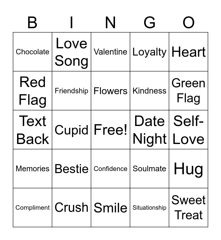 This bingo card has a free space and 24 words: Bestie, Crush, Flowers, Compliment, Heart, Chocolate, Red Flag, Love Song, Date Night, Confidence, Kindness, Text Back, Soulmate, Hug, Friendship, Situationship, Self-Love, Valentine, Green Flag, Cupid, Sweet Treat, Memories, Loyalty and Smile.