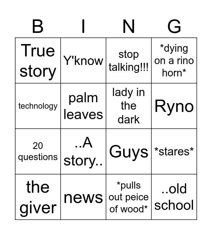 This bingo card has 19 words: Guys, hippo camus, stop talking!!!, ..old school, *stares*, technology, *pulls out peice of wood*, True story, Y'know, 20 questions, ..A story.., palm leaves, lady in the dark, news, the giver, *tells a story*, *dying on a rino horn*, Ryno and the age.