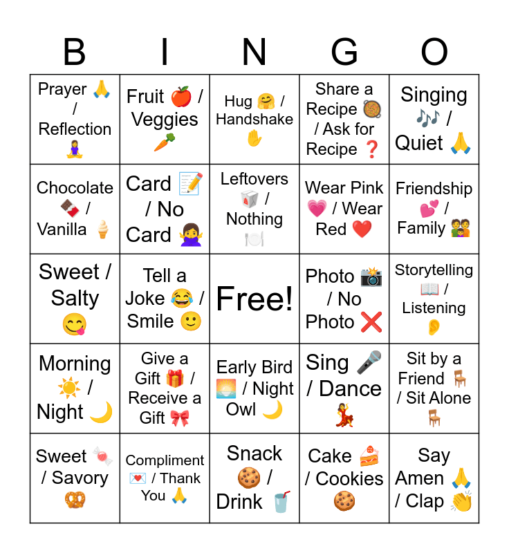This bingo card has a free space and 34 words: Chocolate π« / Flowers πΉ, Cake π° / Cookies πͺ, Coffee β / Tea π΅, Pink π / Red β€οΈ, Morning βοΈ / Night π, Card π / No Card π ββοΈ, Singing πΆ / Quiet π, Sweet π¬ / Savory π₯¨, Fruit π / Veggies π₯, Dessert First π° / Dessert Last πͺ, Leftovers π₯‘ / Nothing π½οΈ, Hug π€ / Handshake β, Laugh π / Smile π, Blessings π / Prayers π, Photo πΈ / No Photo β, Friendship π / Family πͺ, Compliment π / Thank You π, Sweet / Salty π, Give a Gift π / Receive a Gift π, Sing π€ / Dance π, Early Bird π / Night Owl π, Plan Ahead π / Go With Flow π, Prayer π / Reflection π§ββοΈ, Storytelling π / Listening π, Snack πͺ / Drink π₯€, Say Amen π / Clap π, Share a Recipe π₯ / Ask for Recipe β, Talk About Church βͺ / Talk About Family π¨βπ©βπ§, Wear Pink π / Wear Red β€οΈ, Chocolate π« / Vanilla π¦, Give a Compliment π / Receive Compliment π, Tell a Joke π / Smile π, Sit by a Friend πͺ / Sit Alone πͺ and Take Dessert π° / Pass Dessert π ββοΈ.