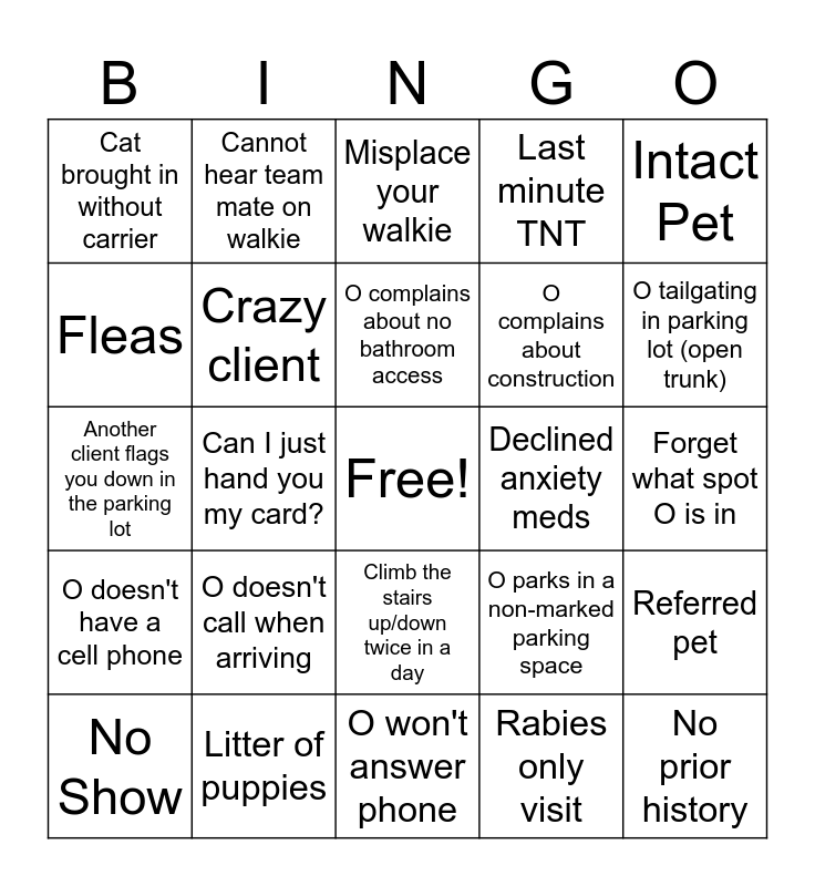 This bingo card has a free space and 24 words: O doesn't call when arriving, Litter of puppies, O complains about no bathroom access, No Show, Intact Pet, Cat brought in without carrier, Fleas, Cannot hear team mate on walkie, Declined anxiety meds, Climb the stairs up/down twice in a day, O complains about construction, Another client flags you down in the parking lot, O parks in a non-marked parking space, Referred pet, Crazy client, Rabies only visit, Forget what spot O is in, Misplace your walkie, O tailgating in parking lot (open trunk), Can I just hand you my card?, No prior history, O doesn't have a cell phone, Last minute TNT and O won't answer phone.