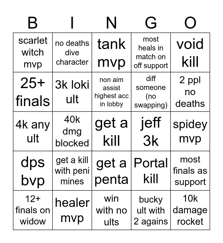This bingo card has a free space and 24 words: get a kill with peni mines, healer mvp, non aim assist highest acc in lobby, 12+ finals on widow, void kill, scarlet witch mvp, 25+ finals, no deaths dive character, jeff 3k, get a penta, diff someone (no swapping), 4k any ult, Portal kill, most finals as support, 3k loki ult, bucky ult with 2 agains, spidey mvp, tank mvp, 2 ppl no deaths, 40k dmg blocked, 10k damage rocket, dps bvp, most heals in match on off support and win with no ults.