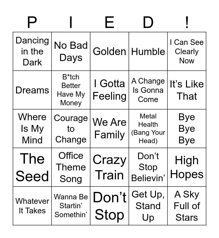 This bingo card has 44 words: Harder, Better, Faster, Stronger, We Are Family, Float On, Whatever It Takes, Help!, Get Up, Stand Up, Golden, Let’s Get It Started, I Can See Clearly Now, Wanna Be Startin’ Somethin’, Humble, Metal Health (Bang Your Head), Crazy Train, Office Theme Song, All the Stars, Don’t Stop, Unwritten, Where Is My Mind, Peace of Mind, It’s Like That, No Bad Days, Five Feet High and Rising, Dashstar* - VIP, Dancing in the Dark, I’m Like a Bird, Bye Bye Bye, Lean on Me, Imagine, Don’t Stop Believin’, The Seed, Not Afraid, High Hopes, Leaving It Up to You, Wind of Change, Courage to Change, Yakety Sax, Lost in the Supermarket, A Sky Full of Stars, I Gotta Feeling, Dreams, A Change Is Gonna Come, Under Pressure, B*tch Better Have My Money and Sound of Silence.