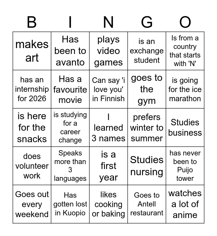 This bingo card has a free space and 24 words: Speaks more than 3 languages, Has gotten lost in Kuopio, Can say 'i love you' in Finnish, Goes out every weekend, Is from a country that starts with 'N', makes art, has an internship for 2026, Has been to avanto, prefers winter to summer, is a first year, goes to the gym, is here for the snacks, Studies nursing, has never been to Puijo tower, Has a favourite movie, Goes to Antell restaurant, Studies business, plays video games, is going for the ice marathon, is studying for a career change, watches a lot of anime, does volunteer work, is an exchange student and likes cooking or baking.