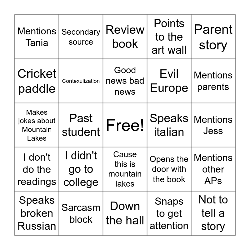 This bingo card has a free space and 27 words: Opens the door with the book, Rings bell, Evil Europe, Down the hall, Cricket paddle, Review book, Secondary source, I don't do the readings, Speaks italian, Mentions other APs, Makes jokes about Mountain Lakes, Points to the art wall, Speaks broken Russian, Sarcasm block, Mentions parents, College board, Contexulization, Good news bad news, I didn't go to college, Mentions Tania, Mentions Jess, Snaps to get attention, Past student, Not to tell a story, Cause this is mountain lakes, Parent story and Mentions his supervisor.