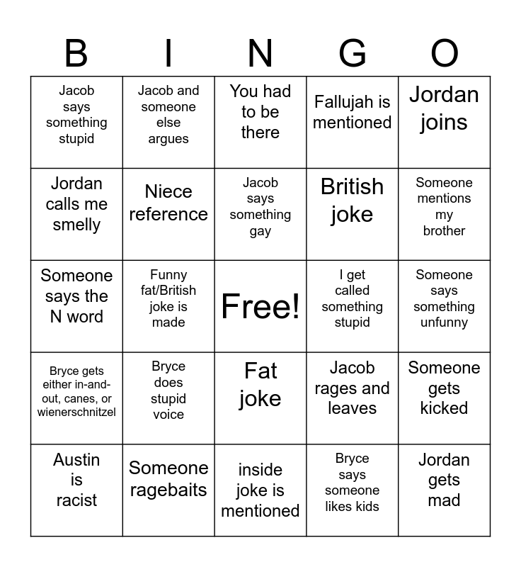 This bingo card has a free space and 24 words: Bryce does stupid voice, Someone ragebaits, Jacob says something gay, Austin is racist, Jordan joins, Jacob says something stupid, Jordan calls me smelly, Jacob and someone else argues, I get called something stupid, Fat joke, British joke, Someone says the N word, Jacob rages and leaves, Someone gets kicked, Niece reference, Bryce says someone likes kids, Someone says something unfunny, You had to be there, Someone mentions my brother, Funny fat/British joke is made, Jordan gets mad, Bryce gets either in-and-out, canes, or wienerschnitzel, Fallujah is mentioned and inside joke is mentioned.