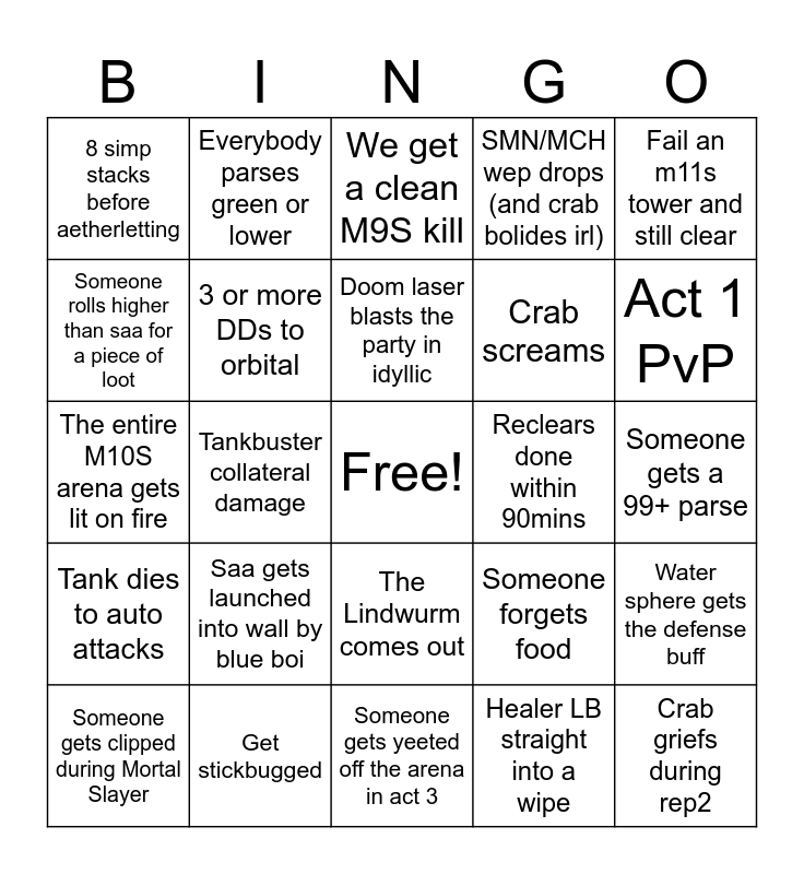 This bingo card has a free space and 24 words: Saa gets launched into wall by blue boi, Get stickbugged, Doom laser blasts the party in idyllic, Someone gets clipped during Mortal Slayer, Fail an m11s tower and still clear, 8 simp stacks before aetherletting, Someone rolls higher than saa for a piece of loot, Everybody parses green or lower, Reclears done within 90mins, The Lindwurm comes out, Crab screams, The entire M10S arena gets lit on fire, Someone forgets food, Water sphere gets the defense buff, 3 or more DDs to orbital, Healer LB straight into a wipe, Someone gets a 99+ parse, We get a clean M9S kill, Act 1 PvP, Tankbuster collateral damage, Crab griefs during rep2, Tank dies to auto attacks, SMN/MCH wep drops (and crab bolides irl) and Someone gets yeeted off the arena in act 3.
