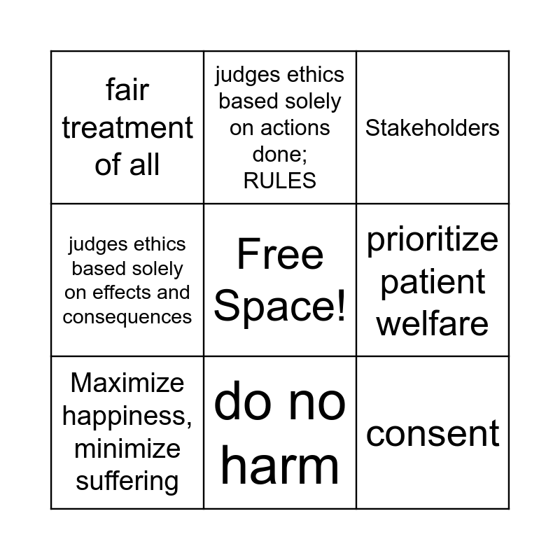 This bingo card has a free space and 8 words: prioritize patient welfare, Stakeholders, judges ethics based solely on actions done; RULES, Maximize happiness, minimize suffering, fair treatment of all, consent, judges ethics based solely on effects and consequences and do no harm.