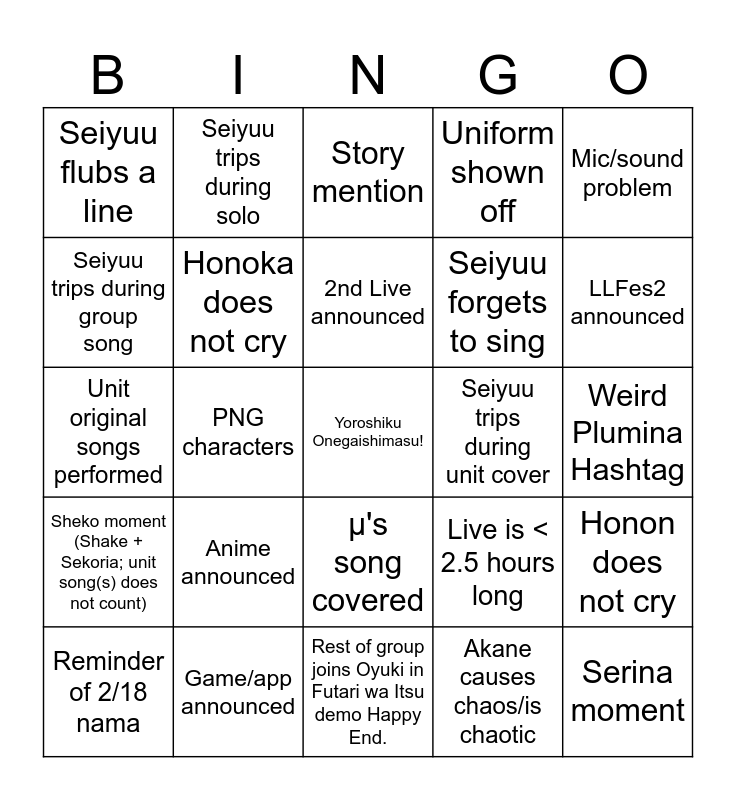 This bingo card has a free space and 24 words: Anime announced, Game/app announced, 2nd Live announced, Reminder of 2/18 nama, Mic/sound problem, Seiyuu flubs a line, Seiyuu trips during group song, Seiyuu trips during solo, Seiyuu trips during unit cover, μ's song covered, Seiyuu forgets to sing, Unit original songs performed, Live is < 2.5 hours long, Honon does not cry, Honoka does not cry, Akane causes chaos/is chaotic, Weird Plumina Hashtag, Story mention, LLFes2 announced, PNG characters, Serina moment, Sheko moment (Shake + Sekoria; unit song(s) does not count), Uniform shown off and Rest of group joins Oyuki in Futari wa Itsu demo Happy End..