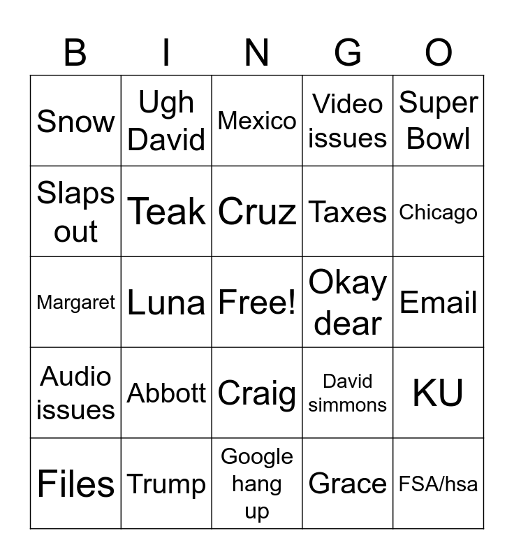 This bingo card has a free space and 24 words: Abbott, Trump, Cruz, Files, Super Bowl, Snow, Slaps out, Ugh David, Okay dear, Craig, Taxes, Margaret, David simmons, KU, Teak, Grace, Email, Mexico, Chicago, Luna, FSA/hsa, Audio issues, Video issues and Google hang up.