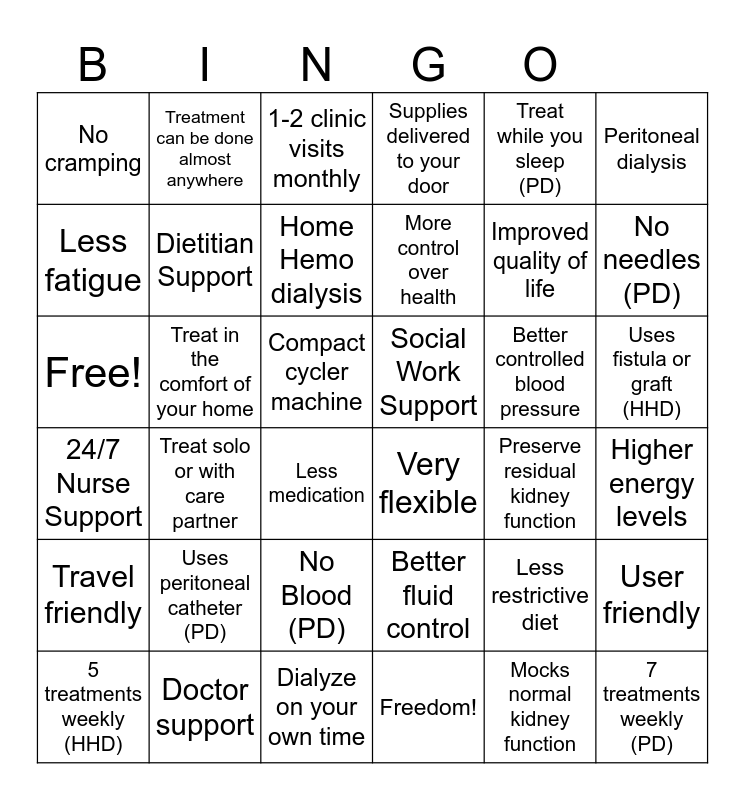 This bingo card has 36 words: Better fluid control, No Blood (PD), Freedom!, Less fatigue, 24/7 Nurse Support, Social Work Support, Dietitian Support, Dialyze on your own time, Treat while you sleep (PD), Less restrictive diet, No needles (PD), Supplies delivered to your door, User friendly, Treat in the comfort of your home, More control over health, No cramping, Travel friendly, Better controlled blood pressure, Free!, 1-2 clinic visits monthly, Compact cycler machine, Treat solo or with care partner, Very flexible, Less medication, Preserve residual kidney function, Treatment can be done almost anywhere, Improved quality of life, Doctor support, Home Hemo dialysis, Peritoneal dialysis, 7 treatments weekly (PD), 5 treatments weekly (HHD), Higher energy levels, Uses fistula or graft (HHD), Uses peritoneal catheter (PD) and Mocks normal kidney function.