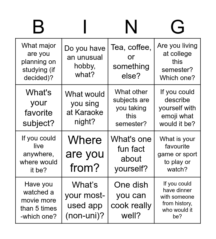This bingo card has 16 words: What’s your most-used app (non-uni)?, What is your favourite game or sport to play or watch?, Tea, coffee, or something else?, What major are you planning on studying (if decided)?, If you could live anywhere, where would it be?, Do you have an unusual hobby, what?, What's one fun fact about yourself?, One dish you can cook really well?, What's your favorite subject?, What would you sing at Karaoke night?, Have you watched a movie more than 5 times -which one?, Are you living at college this semester? Which one?, Where are you from?, If you could describe yourself with emoji what would it be?, What other subjects are you taking this semester? and If you could have dinner with someone from history, who would it be?.