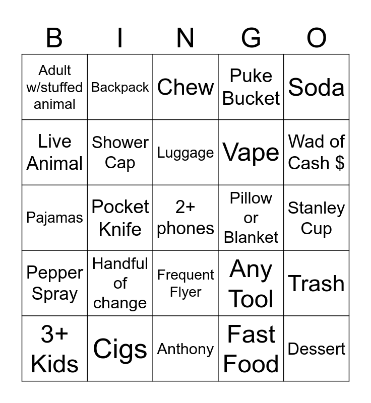 This bingo card has 25 words: Handful of change, Anthony, Luggage, 3+ Kids, Soda, Adult w/stuffed animal, Live Animal, Backpack, Pillow or Blanket, Frequent Flyer, Vape, Pajamas, Any Tool, Trash, Shower Cap, Dessert, Stanley Cup, Chew, Wad of Cash $, Pocket Knife, 2+ phones, Cigs, Pepper Spray, Puke Bucket and Fast Food.